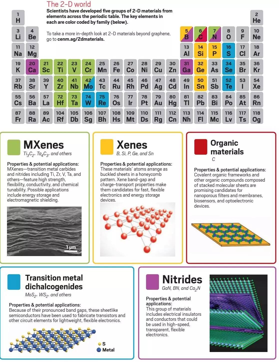自2010年石墨烯獲得諾貝爾物理學(xué)獎以來(lái),科學(xué)家和產(chǎn)業(yè)界對石墨烯就開(kāi)始狂熱的追逐。和石墨的不同之處在于:石墨烯僅有一個(gè)碳原子層厚度,并表現出超優(yōu)異的力學(xué)、電學(xué)等性能。在追逐石墨烯的同時(shí),一大批類(lèi)石墨烯的二維材料也被相繼發(fā)現,從元素周期表來(lái)看,組成這些二維材料元素主要包括:過(guò)渡金屬、碳族元素、硫族元素以及其他。這些納米厚度的二維材料和石墨烯一樣,具有和體相材料截然不同的新性能。