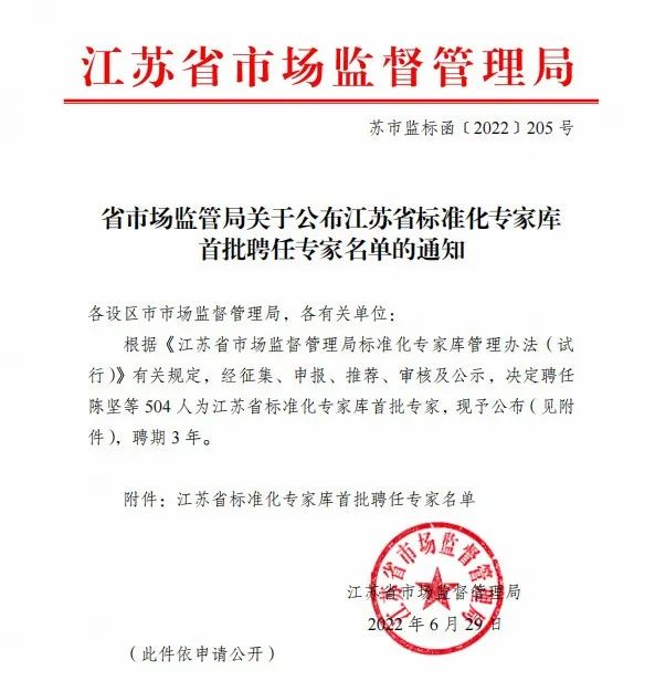 【概要描述】? ? 近日,江蘇省市場(chǎng)監督管理局發(fā)布文件(蘇市監標函[2022]205號),正式公布江蘇省標準化專(zhuān)家庫首批聘任專(zhuān)家名單。根據《江蘇省市場(chǎng)監督管理局標準化專(zhuān)家庫管理辦法(試行)》有關(guān)規定,經(jīng)征集、申報、推薦、審核及公示等環(huán)節,首批聘江蘇省標準化專(zhuān)家504名,巨納集團董事長(cháng)丁榮獲聘為“江蘇省標準化專(zhuān)家庫”首批聘任專(zhuān)家。